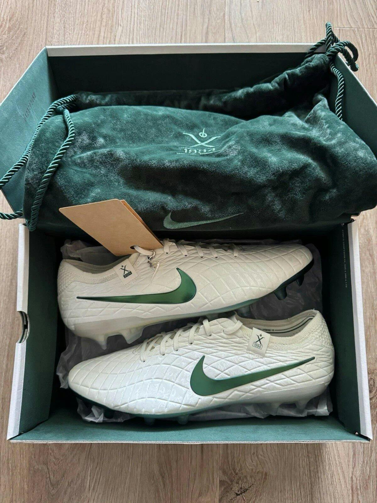 The pearlescent look and green-color shift celebrate the Legend's 30-year anniversary. Previous Tiempo models inspired the upper pattern, but we modernized it through molding to highlight the FlyTouch innovation. On the left cleat it says “1994” on the lace tag and insole, while on the right cleat it says “2024” in those same areas. And keep your eyes peeled for the little Swoosh logo pearl dangling around the eyelet, a fitting finish for a living Legend.